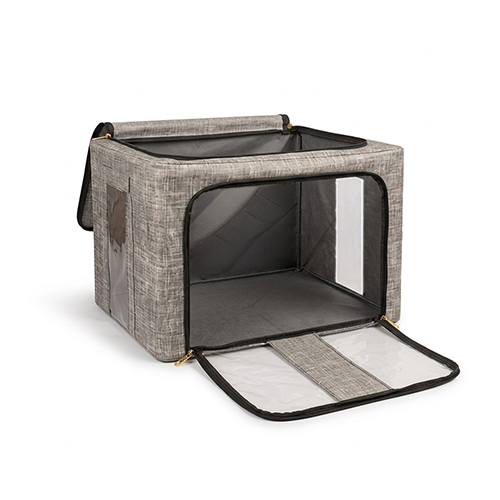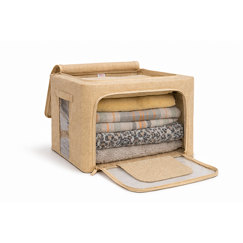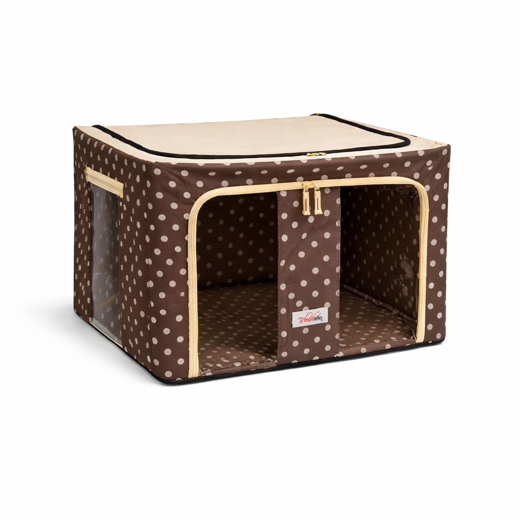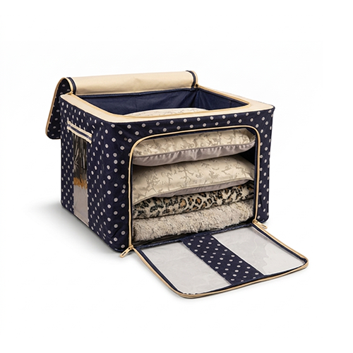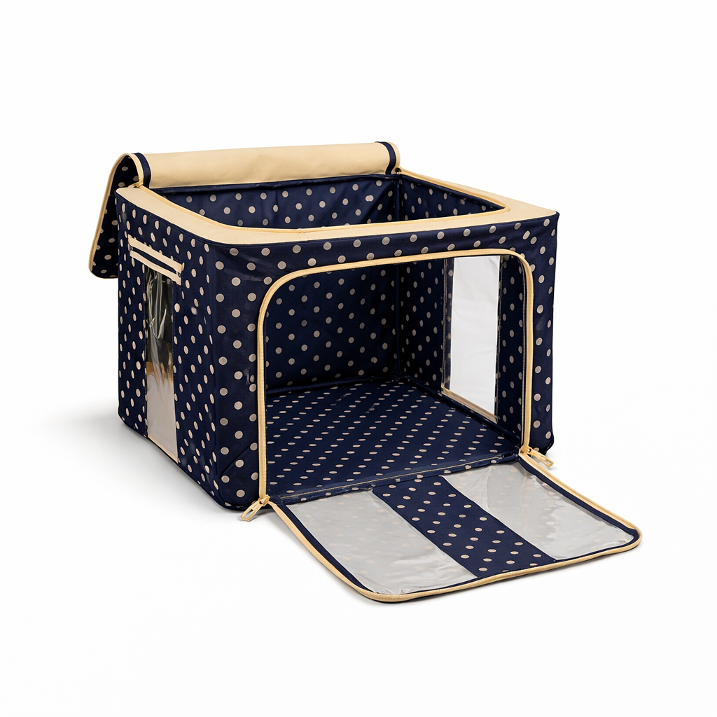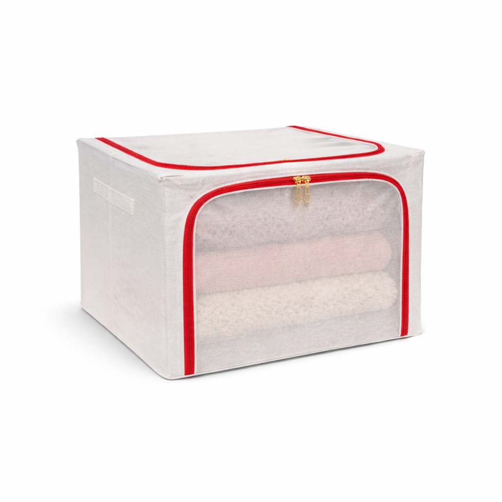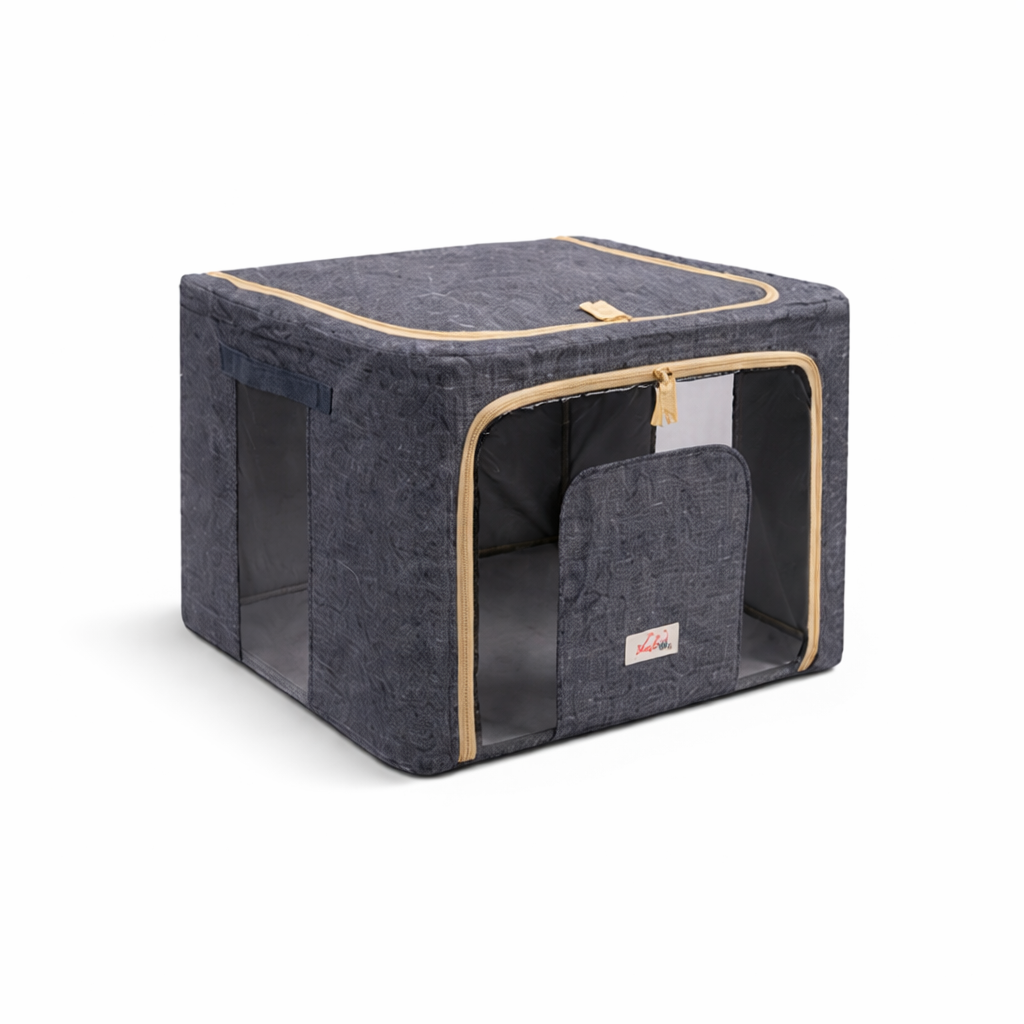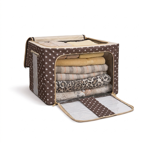 The steel frame supports the fabric and keeps the box firm. Transparent viewing windows let you have a clear view of the items inside. Double zips on the sides and top ensure easy opening and closing. Two handles are for easy carry.