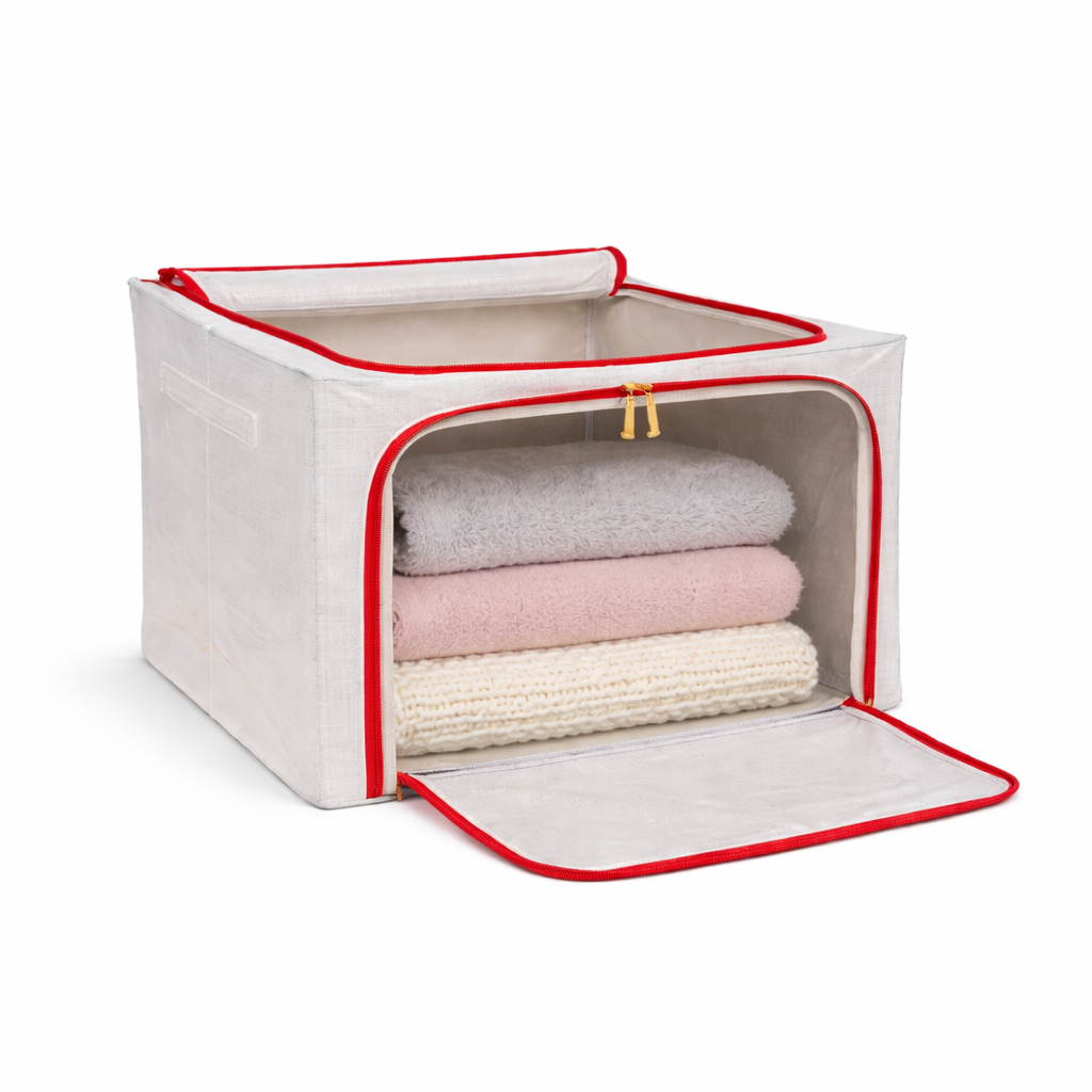 The additional front zipper lets you remove the content without actually lifting the box above it. These boxes are meant to organize your closet in a much better way and they will actually give you extra usable space in the same area.